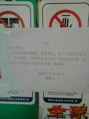 2015717我从15楼下电梯,突然电梯从15层掉到14层,把我腰闪了,我赶紧从14楼下来,给物业打了电话,物业说让人看看,17号晚上我们就回家就发现电梯又坏了,18号才贴出通知说维修,截至19日还没修好,如果这样下去,迟早要把人摔死不可。